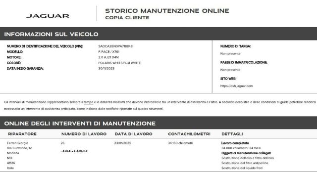 ABS, Adaptive Cruise Control, Adaptive Cruise Control (ACC), Airbag, Airbag laterali, Airbag laterali, Airbag Passeggero, Airbag testa, Alette parasole con luce di cortesia, All Surface Progress Control (ASPC), Android Auto, Apertura portellone elettrica, Apple CarPlay, Autoradio digitale, Avviso cinture di sicurezza, Badge F-Pace, Badge F-Pace R-Dynamic, Blind Spot Monitor, Bluetooth, Bluetooth, Bocchette climatizzatore per i passeggeri posteriori, Bracciolo, Bracciolo anteriore, Brake pad wear indicator, Bright Exterior Pack, Cambio automatico, Cerchi in lega, Cerchi in lega, Chiusura centralizzata, Chiusura centralizzata telecomandata, Climatizzatore, Climatizzatore a due zone, Climatizzatore automatico, Climatizzatore bi-zona, Climatizzatore funzione estesa, Computer di bordo, Console centrale con bracciolo, Console centrale con vano laterale, Controllo elettronico della trazione, Controllo trazione, Cruise Control, Cruise control adattivo, DAB (Digital Audio Broadcasting), Differenziale aperto con Torque Vectoring by Braking (TVBB), Digital Driver Display, Dispositivo di ausilio alla frenata di emergenza (EBA), Dispositivo per frenata di emergenza, Doppio portabicchieri frontale, Dynamic Stability Control (DSC), Eco HMI con analisi dei parametri di guida, ESP, Fari a LED, Fari a LED Premium con luci diurne caratteristiche, Fari automatici, Fari con abbaglianti assistiti, Fari full-LED, Fari LED, Filtro antiparticolato, Finiture in alluminio Engine Spin, Frenata automatica di emergenza, Frenata d'emergenza assistita, Freni anteriori da 355 mm e posteriori da 325 mm, Freno di stazionamento elettrico, Freno di stazionamento elettrico (EPB), Ganci nel vano di carico, Gancio appendi-borsa, Head-up Display, Head-Up Display, Hill Launch Assist - assistenza per partenza in salita, Hotspot Wi-Fi, Illuminazione console superiore, Immobilizzatore elettronico, Impianto audio, Impianto audio Meridian Surround Sound System, InControl Remote, Indicatori cambio corsia, Indicatori direzionali animati, Interni in pelle, Interni in pelle, Isofix, Jaguar Drive Control, Lane Assist, Lane Keep Assist, Limitatore di velocità, Logo e scritta Jaguar, Luci Diurne A Led, Luci fendinebbia posteriori, Lunotto riscaldato, Maniglie delle porte anteriori interne con interruttori di blocco separati, Monitoraggio angolo cieco, Monitoraggio delle condizioni del guidatore, Monitoraggio pressione pneumatici, Navigatore satellitare, Online Pack con Data Plan, Palette del cambio cromate satinate, Park distance control, Pinze dei freni standard, Pivi Pro (Connected), Pneumatici estivi, Poggiatesta anteriori passivi con prevenzione del colpo di frusta, Portaoggetti con serratura, Portellone elettrico, Presa USB, Prese 12V addizionali posteriori e bagagliaio, Pulsante Start, Radio DAB, Regolazione elettrica sedili, Riconoscimento dei segnali stradali, Riconoscimento dei segnali stradali, Rilevatore temperatura esterna, Rivestimento padiglione Ebony in tessuto Morzine, Secure TackerPro (36 mesi), Secure Tracker 12 mesi, Sedile posteriore sdoppiato, Sedili elettrici con memoria, Sedili posteriori ribaltabili 40:20:40 con poggiatesta e bracciolo centrale, Sedili riscaldati, Sedili Sport in pelle goffrata Ebony con interni Ebony/Ebony, Sensore appannamento, Sensore di luce, Sensore di pioggia, Sensore luci, Sensore pioggia, Sensori di parcheggio assistito anteriori, Sensori di parcheggio assistito posteriori, Sensori di parcheggio posteriori, Sensori parcheggio anteriori e posteriori, Sequenza di accensione: movimenti, quadrante e illuminazione, Servosterzo, Servosterzo elettrico (EPAS), Sistema di avviso di distanza, Sistema di chiusura per bambini ad azionamento elettrico, Sistema di controllo pressione pneumatici (TPMS), Navigatore satellitare, Sistema di rilevazione della stanchezza, Sistema posteriore di ancoraggio ISOFIX per seggiolino bambini, Soglie di ingresso con scritta Jaguar, Sound system, Specchietti laterali elettrici, Specchietti retrovisori elettrici, Specchietto retrovisore interno fotocromatico, Start/Stop Automatico, Supporto lombare, Telecamera per parcheggio assistito, Telecamera posteriore, Tergicristalli con sensore pioggia, Tergicristalli intermittenti variabili, Terzo poggiatesta posteriore, Tetto standard, Touch Screen, Trailer Stability Assist (TSA), Trazione integrale, Usb, Vano di Carico - Punti di ancoraggio bagagli, Vano portaoggetti delle portiere anteriori, Vano portaoggetti delle portiere posteriori, Veicolo non fumatori, Vernice pastello Fuji White, Vetri oscurati, Vetri Oscurati Posteriori, Voice control, Volante in pelle, Volante multifunzione