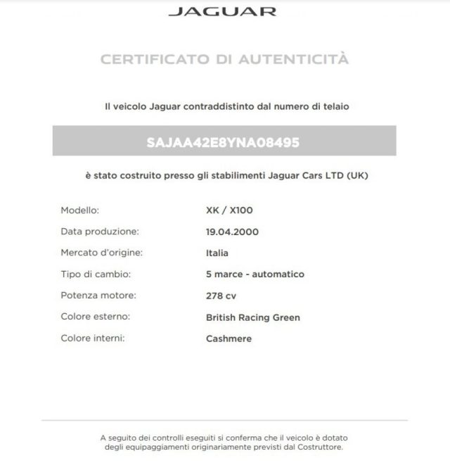 Si tratta dell'unico documento ufficiale Jaguar o Land Rover che attesta la piena corrispondenza della propria automobile alle specifiche originali con cui l'auto era uscita dalla fabbrica.